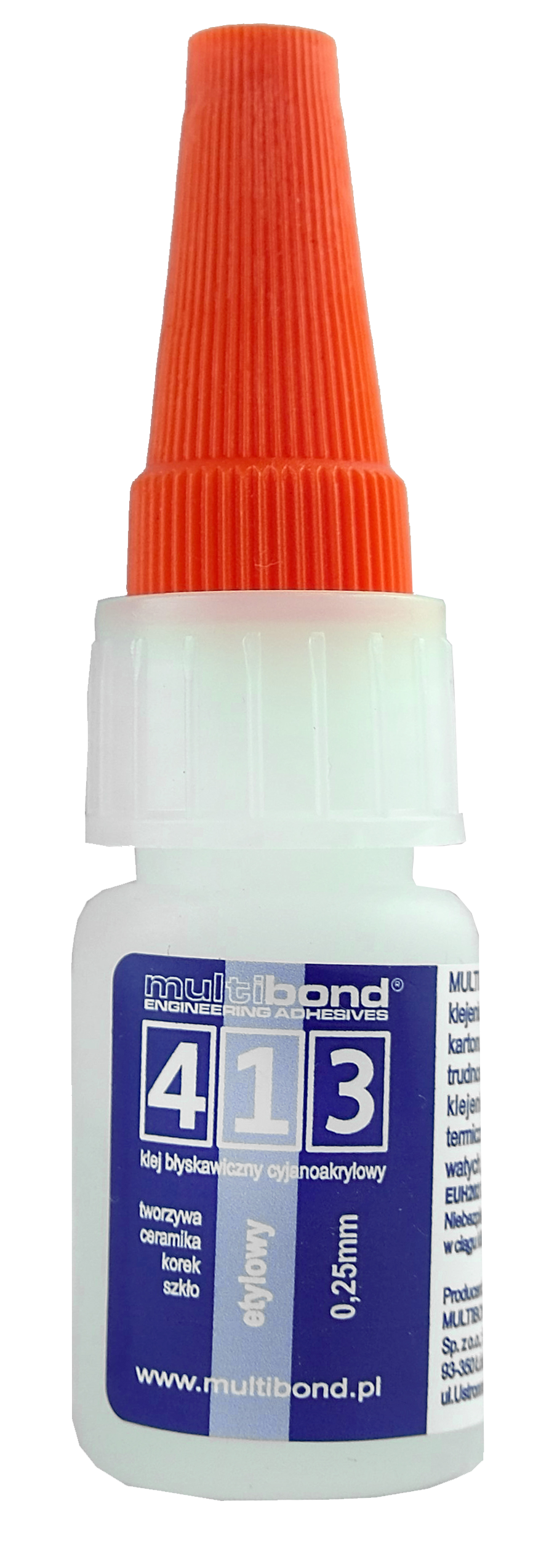 | MULTIBOND 413 | 10g | uniwersalny klej błyskawiczny o oleistej konsystencji do klejenia różnych materiałów w tym lekko wsiąkliwych (skóra) lub porowatych. Najlepiej sprawdza się w spoinach o małej powierzchni takich materiałów jak: większość tworzyw, drewno, szkło, korek, skóra, karton, metale, kamień itp. Tworzy spoiny cienkie, twarde i mocne. Łatwo nim skleić palce ! |