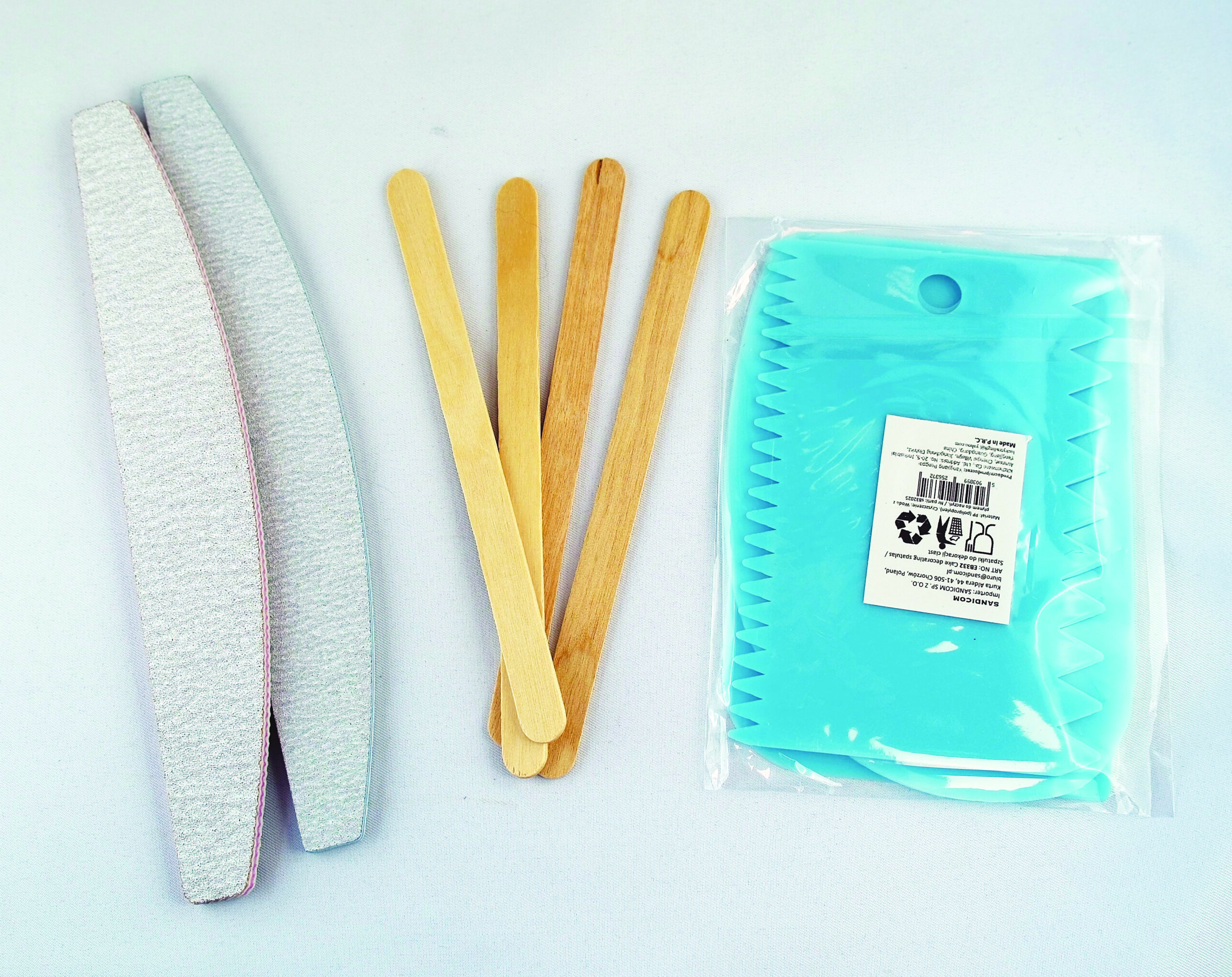 | zestaw | Komplet dwu pilniczków z papierem ściernym o uziarnieniu 100/180/240, drewniane szpatułki i pojemniczki do mieszania klejów, płytki z PE do nakładania klejów i szpachlówek |