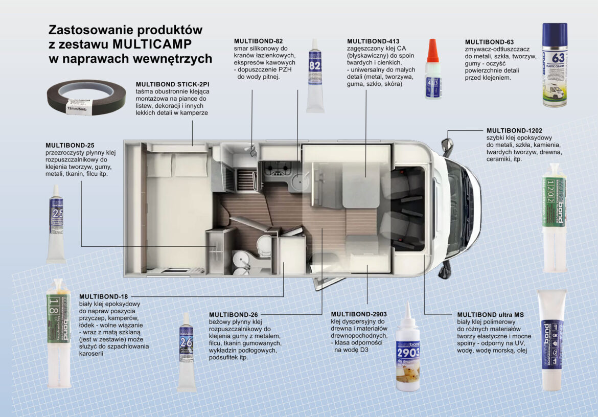 <MultiCamp> – to zestaw środków naprawczych dobranych tak, aby w warunkach terenowych lub w podróży umożliwić wykonanie we własnym zakresie podstawowych napraw pojazdu campingowego, łodzi lub jachtu, namiotu, sprzętu turystycznego, wodniackiego, wędkarskiego lub zabawek plażowych. Kamper, przyczepa czy też jacht to urządzenia skomplikowane i zbudowane z różnych materiałów, to mnóstwo połączeń i uszczelnień, które nie mogą zawieść w czasie podróży. Jeśli tak się jednak staje – trzeba mieć czym je naprawić i wiedzieć jak to zrobić.